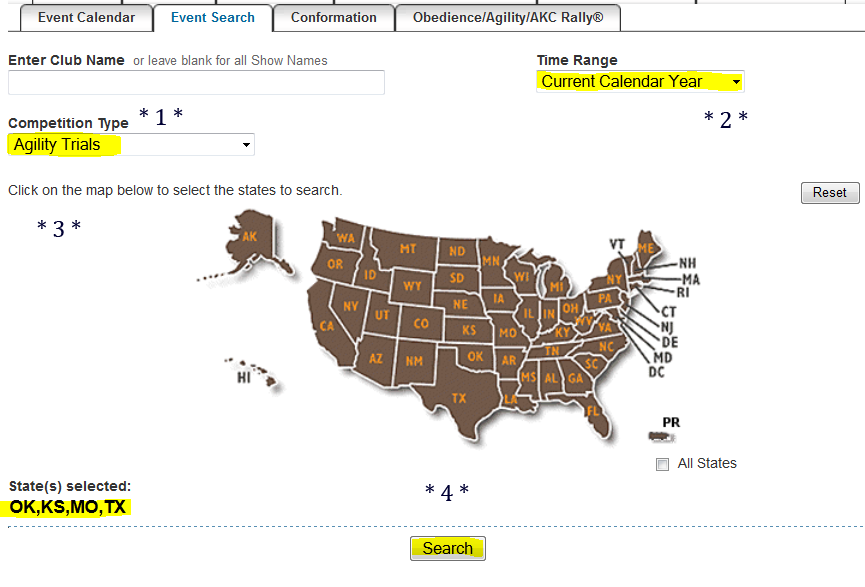 For a calendar of events go to the AKC Event Search Obedience, Agility, and Rally set the competition type to "Agility Trials", time Range to "Current Calendar Year", select the state or states you want to include in your search and click search.